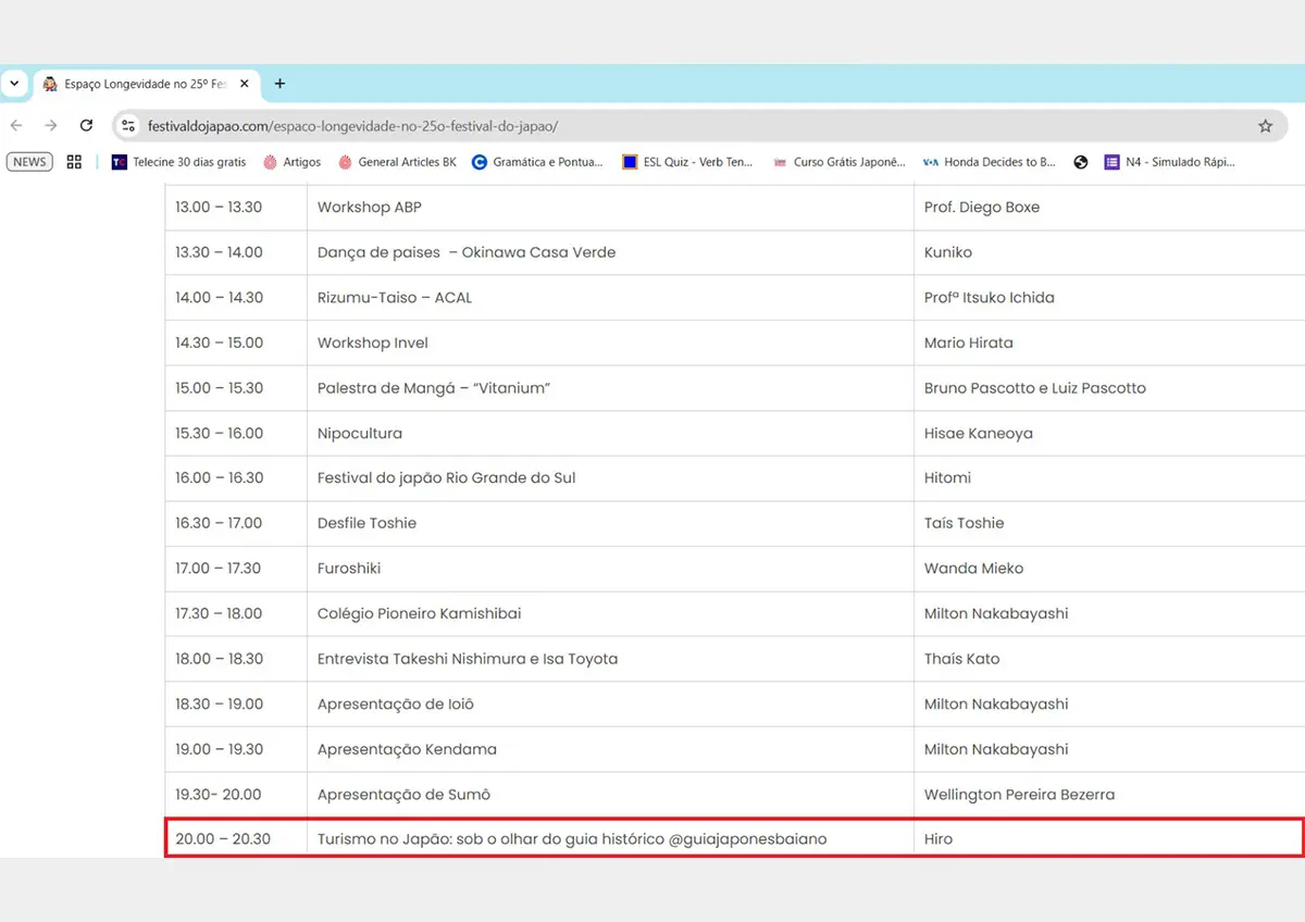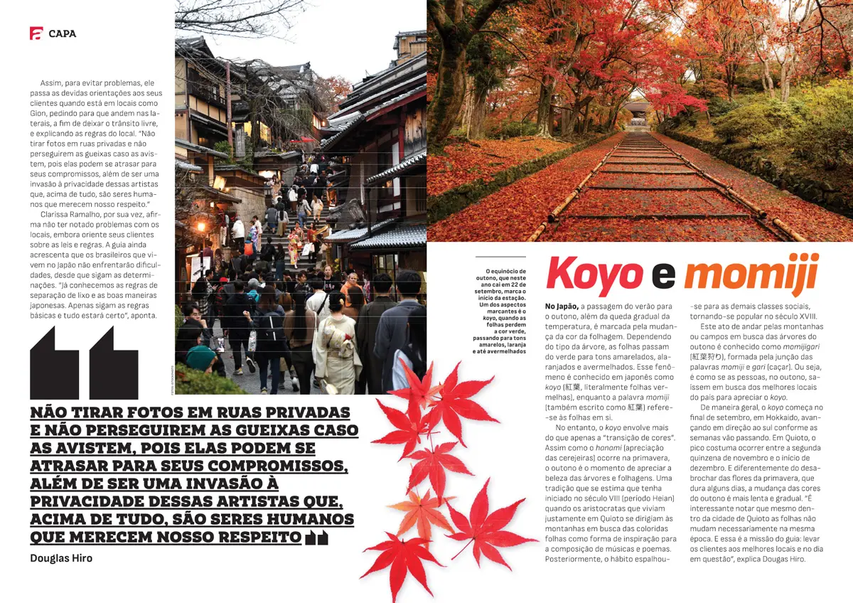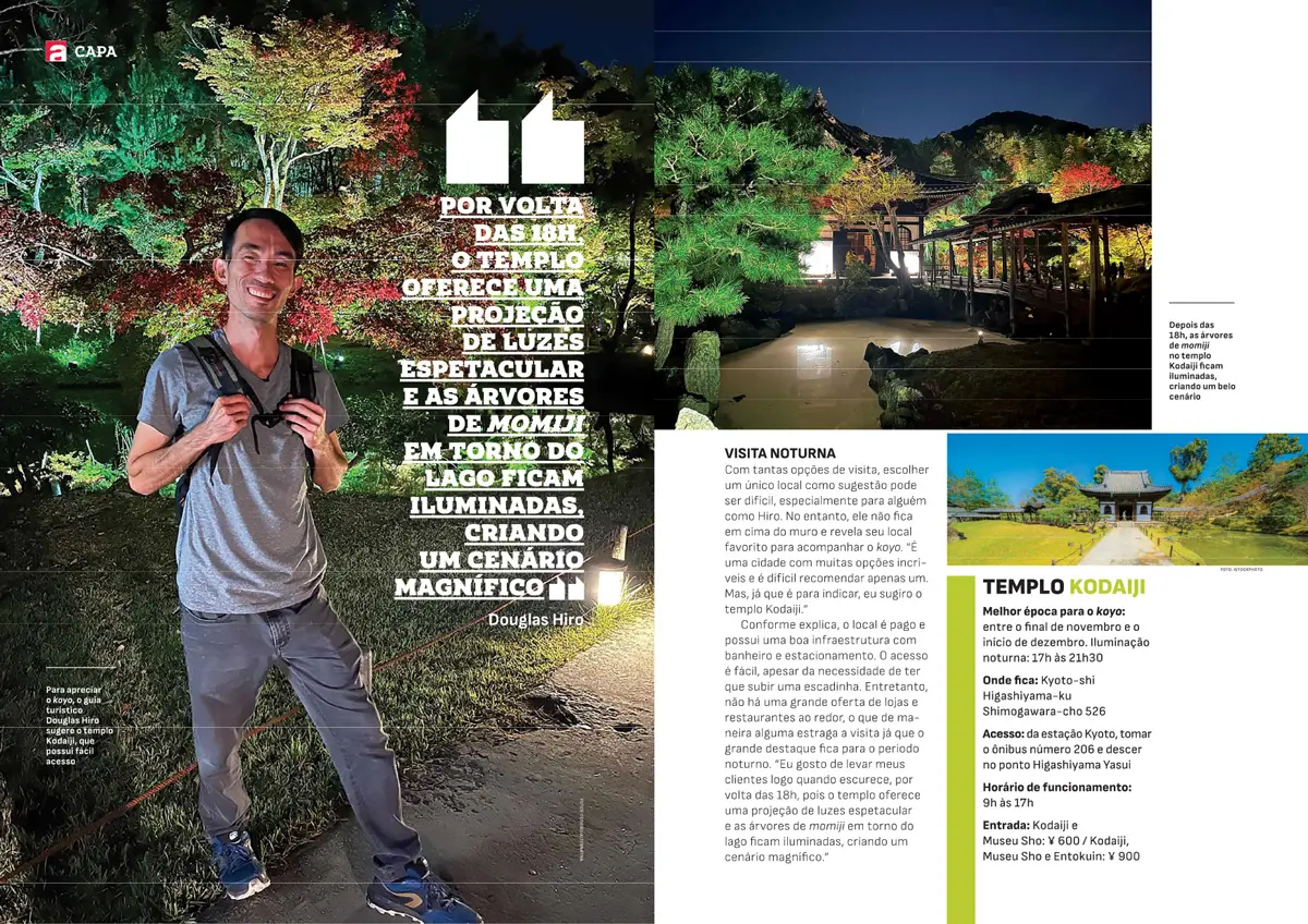 Há cerca de três anos, abandonei minha carreira para mergulhar de vez na cultura japonesa e viver de perto tudo o que eu sempre admirei. E em 2024, tive a honra de ser convidado para palestrar sobre turismo no Japão no Festival do Japão em São Paulo, o maior evento de cultura japonesa fora do Japão, e também concedi uma entrevista para a maior revista sobre o Japão em português (Revista Alternativa), falando sobre gueixas e a beleza das folhas de outono em Kyoto (baixe o PDF aqui).
